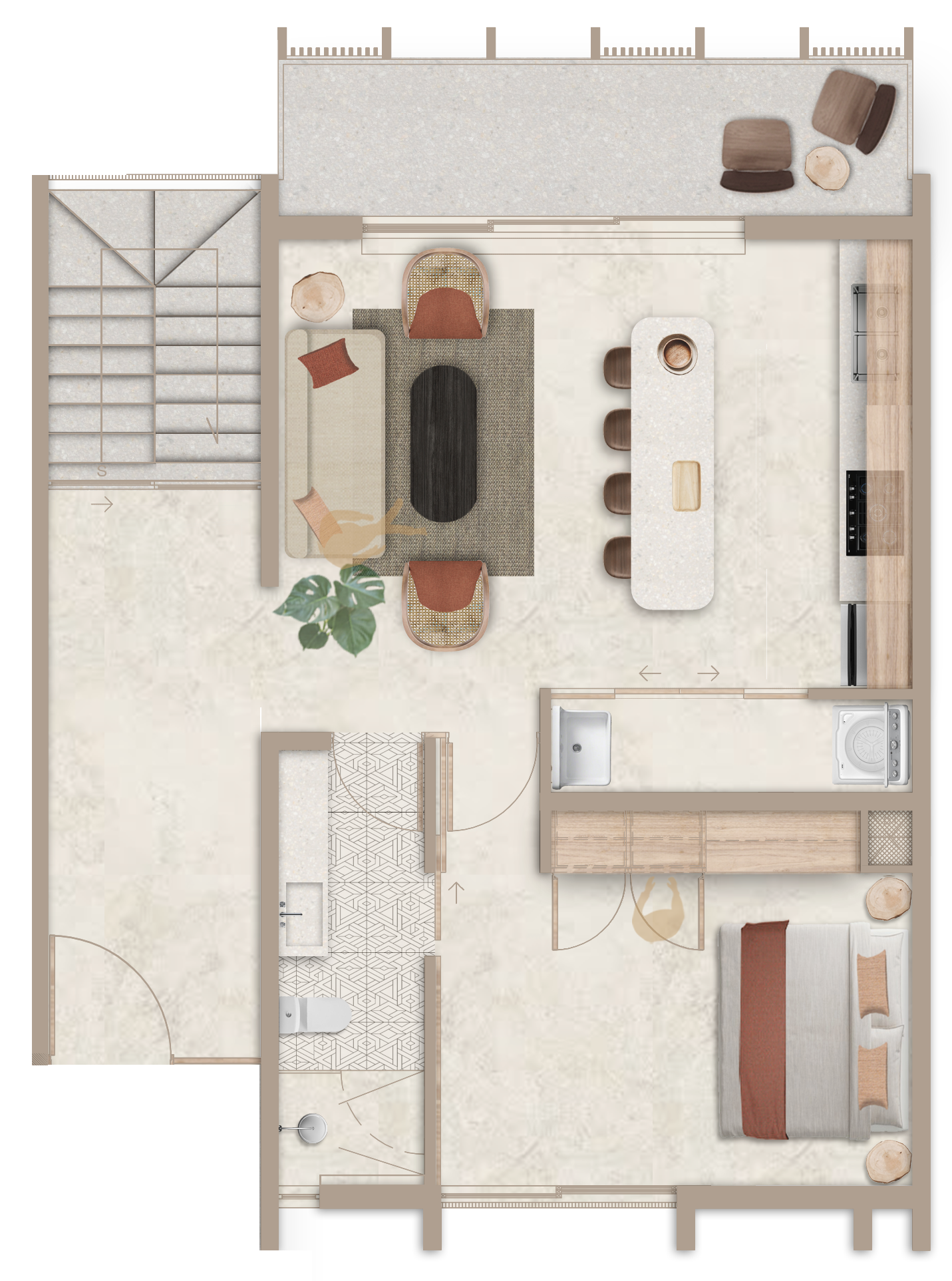 Private broad terrace with Lounge Area, shaded Dining area and Plunge Pool